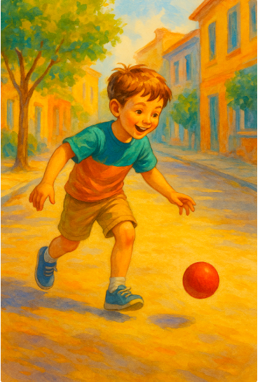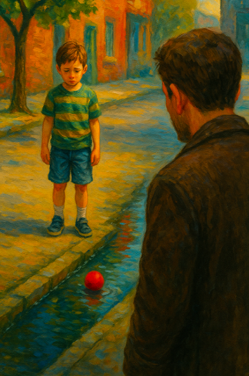 The poet observes a young boy whose ball has been lost. The ball bounces along the street and finally falls into the water.