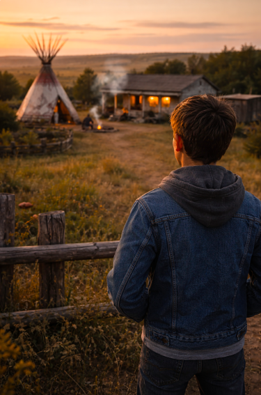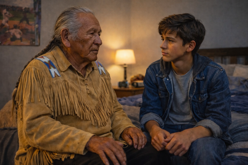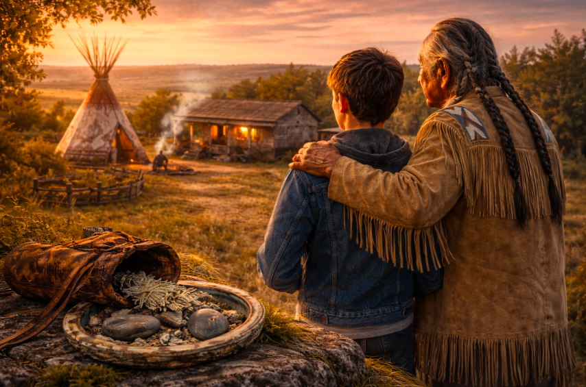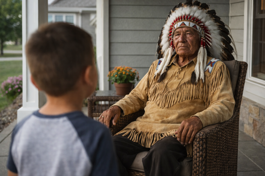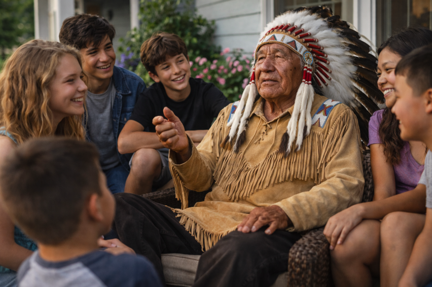 But still, one day they come home. When Martin’s own friends finally meet Grandpa, they are polite and impressed by him, especially when he wears his traditional clothes. This makes Martin feel proud of his great-grandfather. However, he still feels nervous about accepting the medicine bag because he worries his friends might laugh, as the pouch looks old and dirty.
