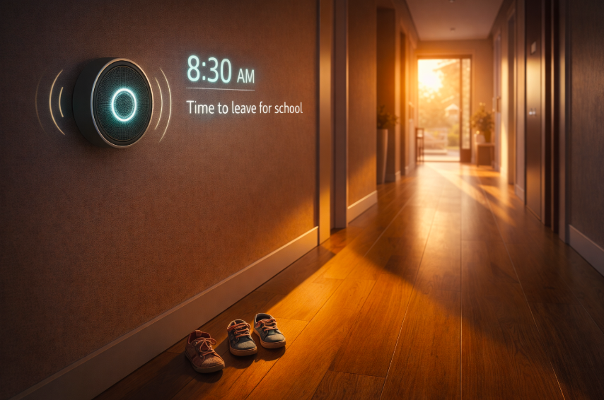 At 7:00 a.m., a voice-clock sings to wake the people in the house, just like alexa or google home. In the kitchen, the stove prepares breakfast-automatically!! Toast, eggs, bacon, two cups of coffee, and two glasses of milk. Another voice announces the date, birthdays, annive.kmrsaries, and unpaid bills.