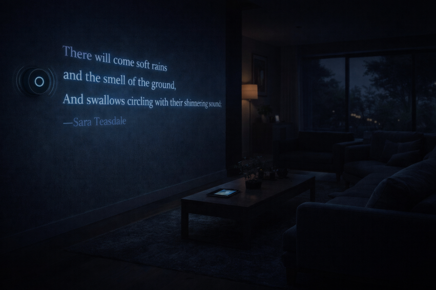 At 9:05, a voice asks Mrs. McClellan which poem she would like to hear. When no answer comes, the house chooses a poem by Sara Teasdale, There Will Come Soft Rains. So the poem is about how nature will continue peacefully even if all humans die, and the world will not miss them. Music plays, the cigar burns to ash, and the house remains empty.