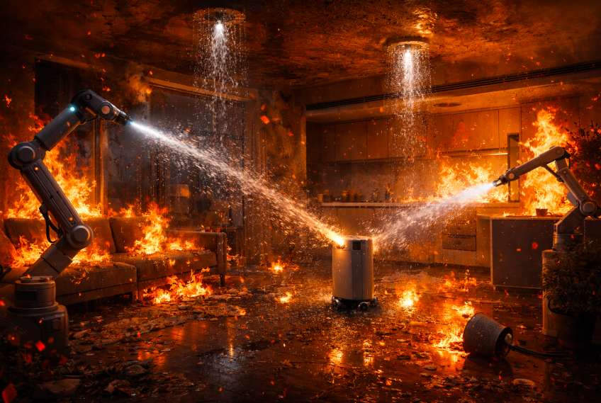 At 10:00 p.m., the disaster happens. A tree branch crashes through a kitchen window, and cleaning chemicals are spilled everywhere. As a result fire starts. The house cries “Fire!” The house tries to save itself. And tries to stop the fire with water sprays and alarms, but the fire spreads quickly. The water is finished, all the systems fail, and flames move through the house.
